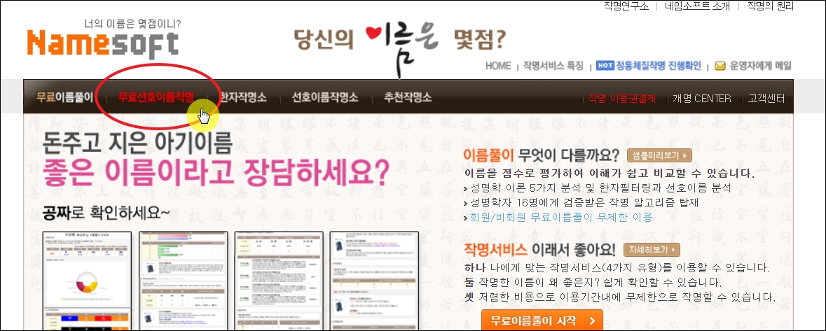 ▼네임 소프트 사이트에 접속하면 2가지 무료 서비스를 만나볼 수 있습니다. 하나는 무료 성명풀이 서비스이고, 다른 하나는 작명 서비스입니다. 무료 버전이라고 하여도 300개의 한글 이름과 15개의 한자를 추천 받을 수 있기 때문에 예쁜 이름을 얻는 데에 충분합니다.