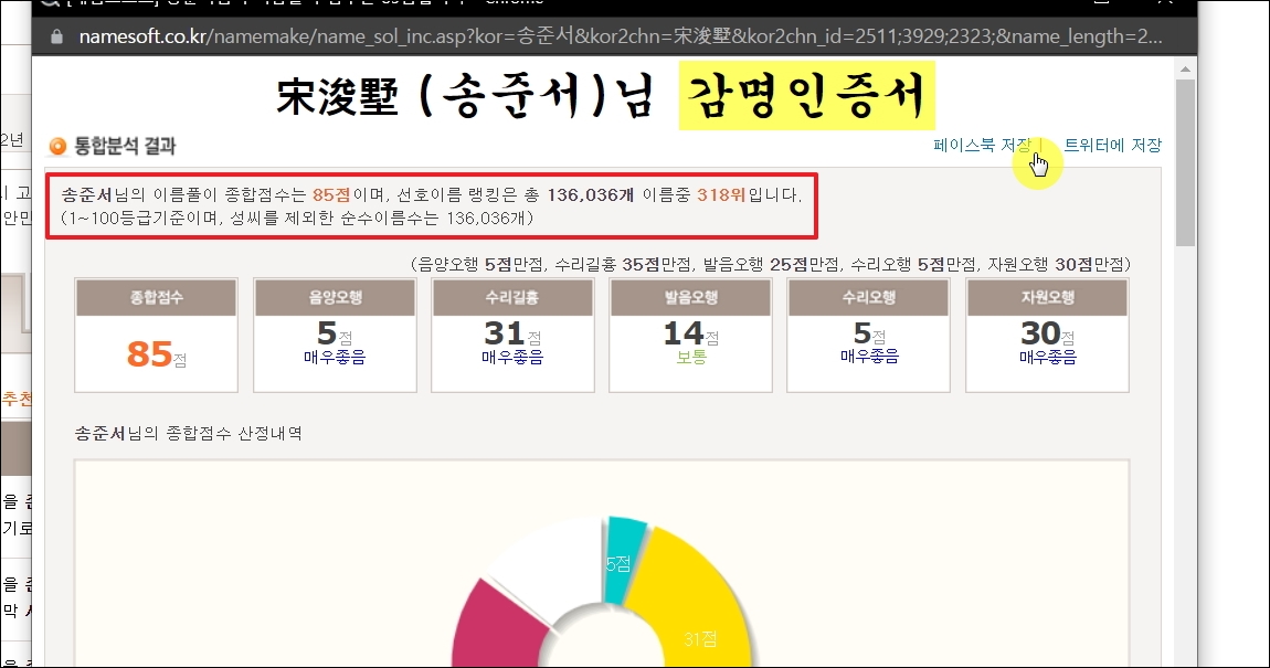 ▼마음에 드는 한자를 선택한 후 [이름 풀이] 버튼을 누르면 감명인증서를 확인할 수 있습니다. 종합점수와 선호도 순위 확인을 통해 얼마나 괜찮은 이름인지 쉽게 파악할 수 있습니다. 페이스북이나 트위터로 저장도 가능하기 때문에 주위 사람들과 공유도 가능합니다.