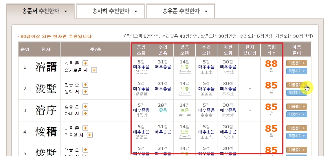 ▼성명학 기반으로 추천한 한자를 살펴볼 수 있는 페이지가 열렸습니다. 좋은 뜻을 가진 한자를 찾아보고, 그중에서 성명학 기준으로 평가된 점수를 참고하여 선택하면 됩니다. 음양의 조화, 수리 오행, 자원 오행, 발음 오행, 수리길흉 이렇게 5가지 성명학 이론에 근거한 평가 결과를 확인할 수 있습니다.