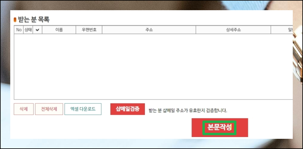 주소록 입력이 완료되면 받는 분 목록에 정보가 추가됩니다. 이 단계에서 '[본문 작성]' 버튼을 눌러 다음으로 진행하세요.