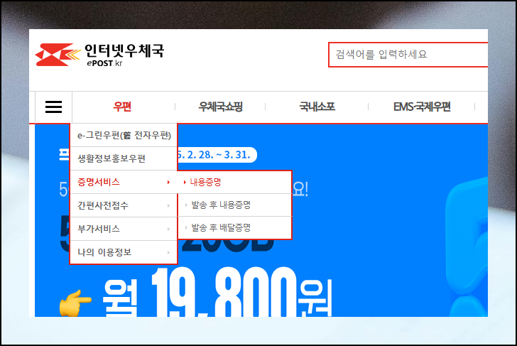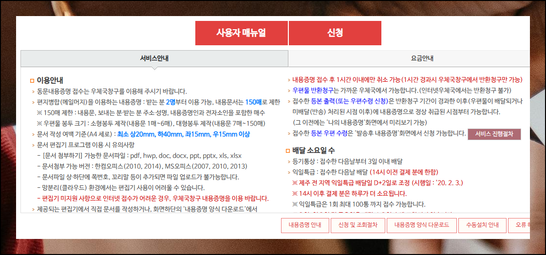 인터넷 우체국 웹사이트에 접속해서 상단 메뉴 중 '우편'을 선택하세요. 그러면 6가지 항목이 나타나는데, 세 번째 '증명 서비스'를 눌러 내용증명 관련 서비스를 확인할 수 있어요.