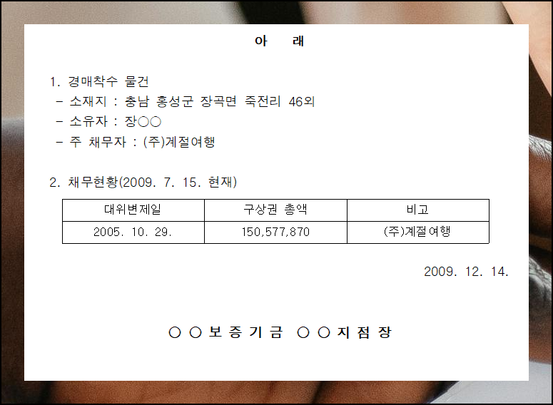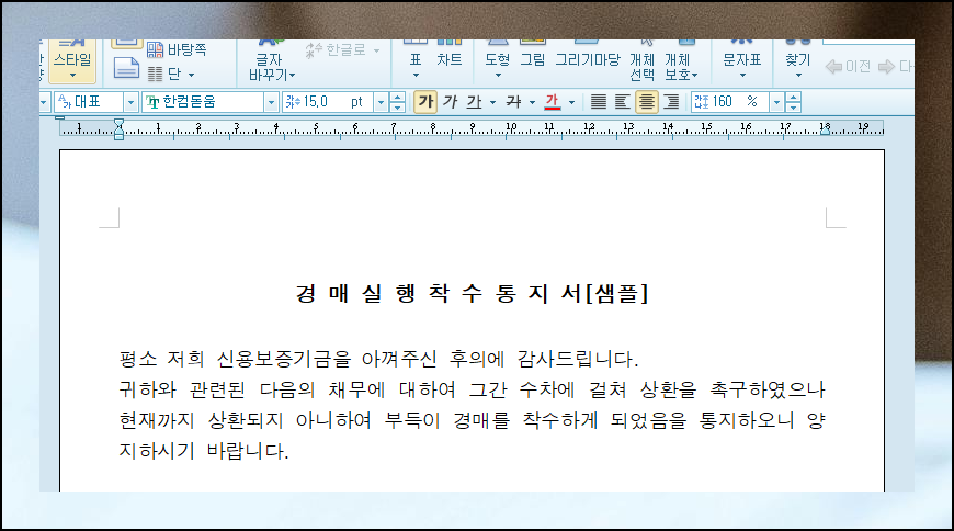양식 파일을 하나 받아 살펴보니 '경매실행 착수 통지서 샘플'에는 많은 내용이 미리 작성되어 있어요. 이런 예시를 수정하면 간편하게 내용증명을 준비할 수 있답니다.