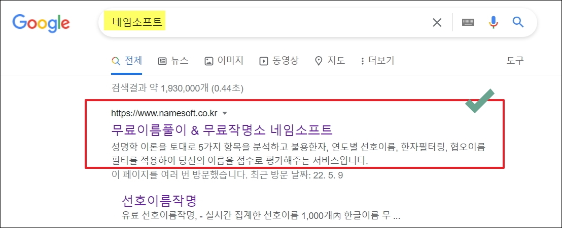 ▼앞에서 본 인기 순위와 더불어 예쁜 이름 좋은 이름을 짓는 데에 도움이 되는 사이트를 알려드리겠습니다. 바로 네임소프트 입니다. 이곳에서 제공하는 무료 작명 서비스를 이용해 볼테니 따라해 보시길 바랍니다.