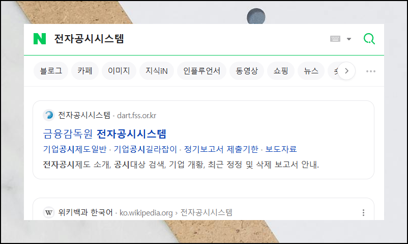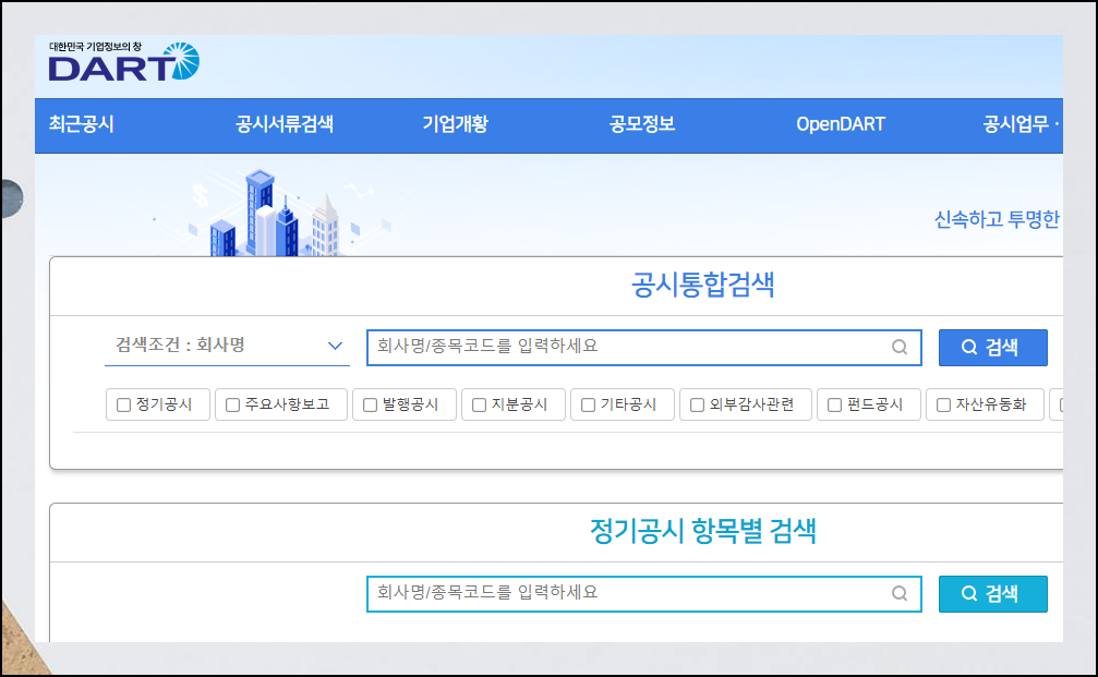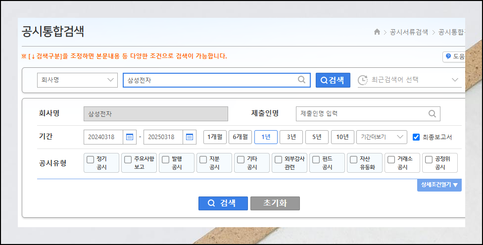 조회 후에는 전자공시시스템 메인화면으로 돌아옵니다. 화면 중앙의 검색창에 선택한 기업명이 자동으로 입력되어 있어요. 이 상태에서 검색 버튼을 누르면 더 자세한 내용을 파악할 수 있습니다. 누구나 쉽게 이용할 수 있도록 설계된 화면이 특징이죠.