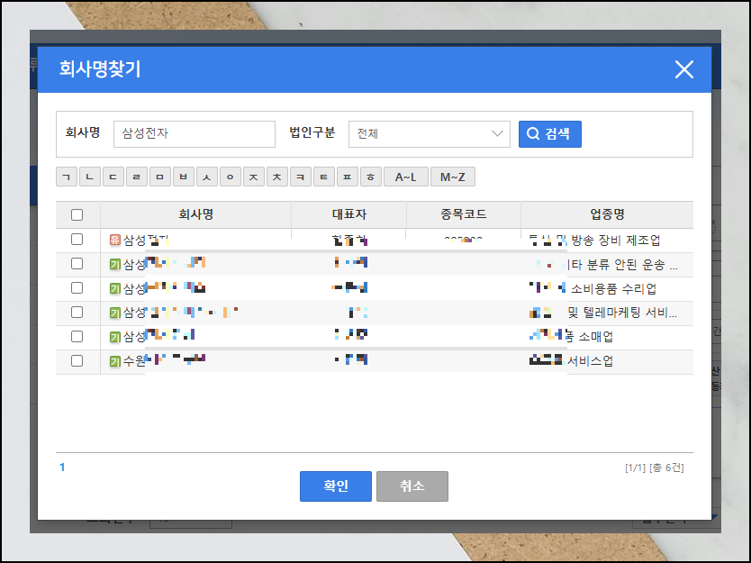 "삼성전자"를 입력해보면 우리가 알고 있는 삼성전자뿐 아니라, 이 키워드가 포함된 다양한 업체명이 함께 표시됩니다. 원하는 기업을 발견했다면 해당 상호를 클릭해주세요. 여러 결과물 중에서 정확한 회사를 선택하는 것이 중요합니다.