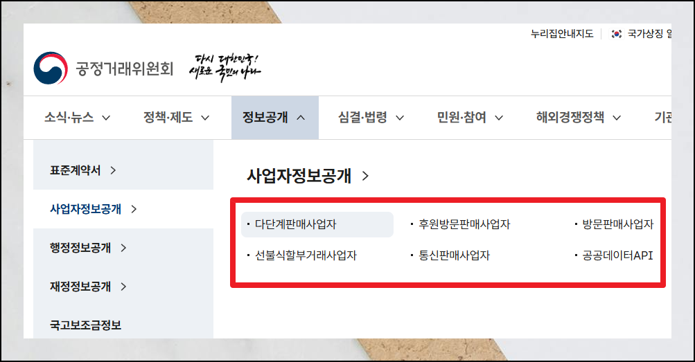 공정거래위원회 홈페이지에 접속한 후, [정보공개] 메뉴를 클릭하면 사업자등록현황 카테고리가 나타납니다. 이 항목에 속한 5가지 유형에 대한 정보를 조회할 수 있어요: 통신판매, 방문판매, 전화권유판매, 다단계판매, 후원방문판매사업자입니다. 각 종류별로 구분되어 필요한 자료를 체계적으로 찾을 수 있습니다.
