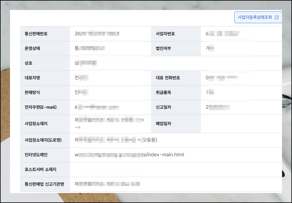 선택한 회사의 데이터는 표 형태로 깔끔하게 정리됩니다. 통신판매번호, 신고현황, 상호, 대표자명, 취급품목, 법인여부 등 다양한 항목을 한눈에 파악할 수 있어요. 이 자료는 거래 전 기업의 신뢰성을 점검하거나 협업 파트너를 검증할 때 매우 효과적으로 활용됩니다.