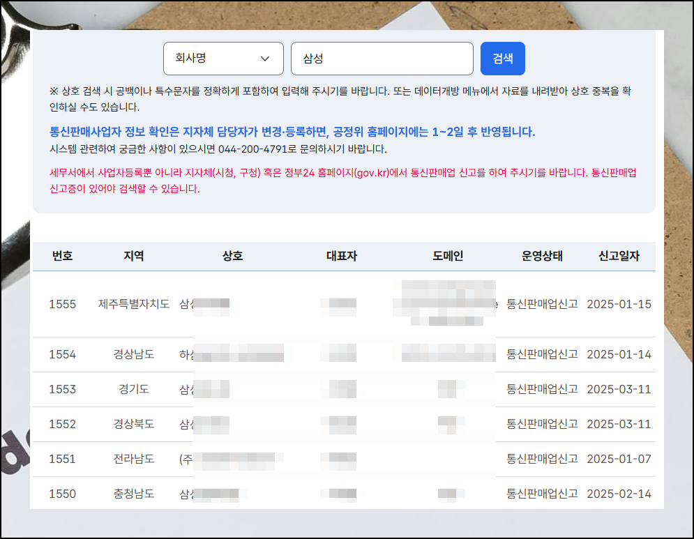 요즘은 대부분의 회사들이 통신판매업을 운영하고 있어요. 그래서 찾으려는 기업 정보가 여기에 등재되어 있을 가능성이 높습니다. 새 페이지에서 검색어를 기입하고 조회를 시작해보세요. 상호뿐만 아니라 사업자번호, 통신판매번호, 대표자 이름으로도 검색이 가능해 원하는 내용을 다양한 방법으로 찾을 수 있어요.