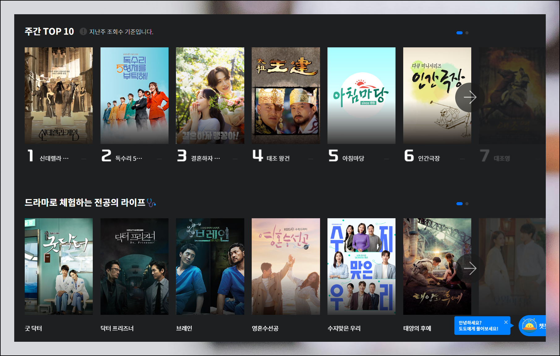 재시청 페이지에는 주간 인기 순위(TOP 10) 목록이 보입니다. 현재 방영 중인 인기 작품과 함께, "태조 왕건"과 같이 과거에 많은 사랑 받은 완결작도 있어요. "살림남"이나 "인간극장"과 같이 드라마 외 작품도 기다리고 있습니다. 자신의 취향에 맞는 콘텐츠를 선택해서 즐겨보세요. 새로운 발견이나 오래된 추억을 되살리는 즐거움을 경험할 수 있을 거예요.