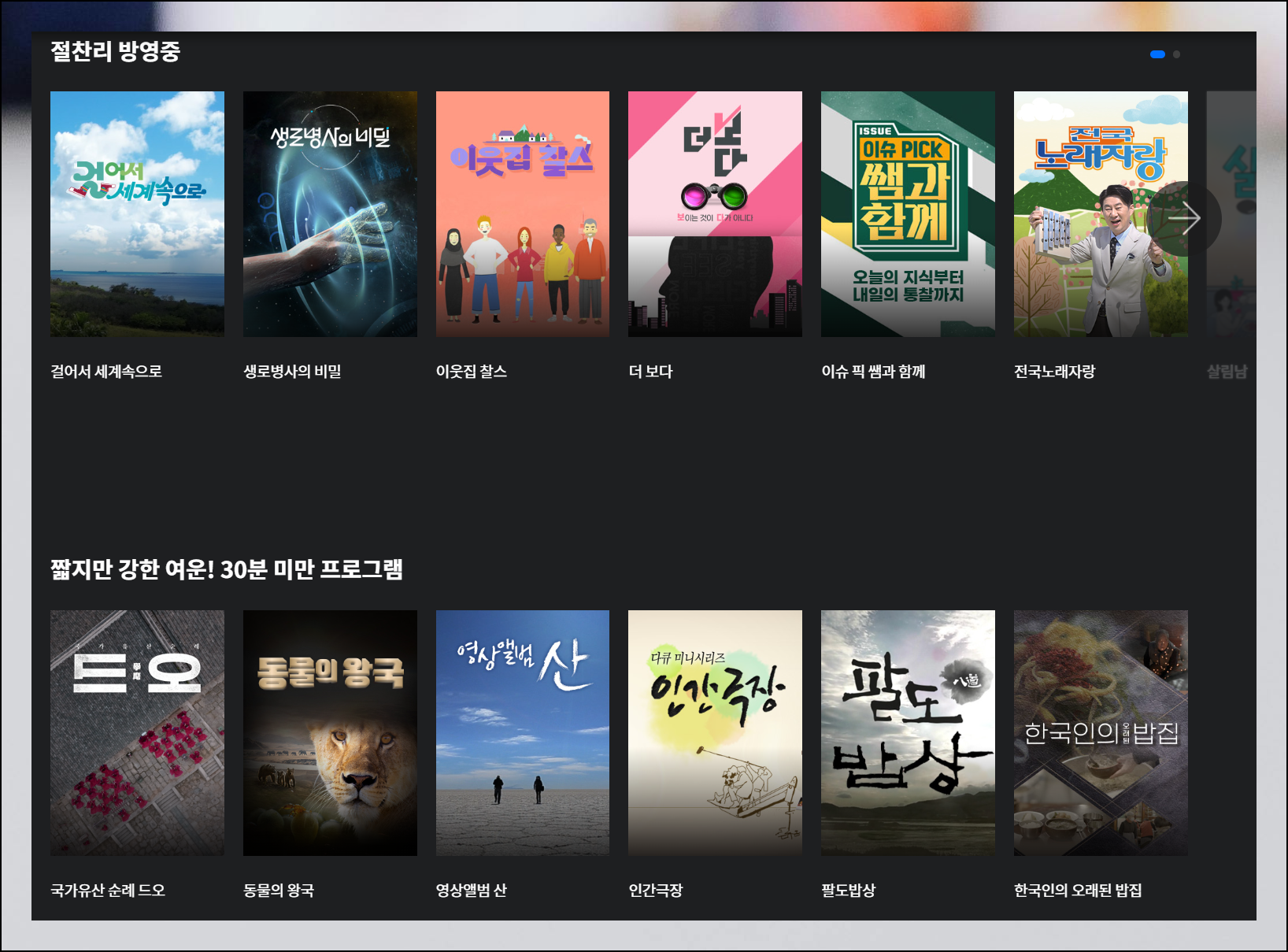 특히 회원가입이나 로그인 절차 없이도 대부분의 프로그램을 즐길 수 있어 접근성이 뛰어납니다. 더불어 현재 방영 중인 최신작부터 '태조 왕건'이나 '태양의 후예' 같은 인기 완결작까지 다양한 콘텐츠를 만나볼 수 있어요.