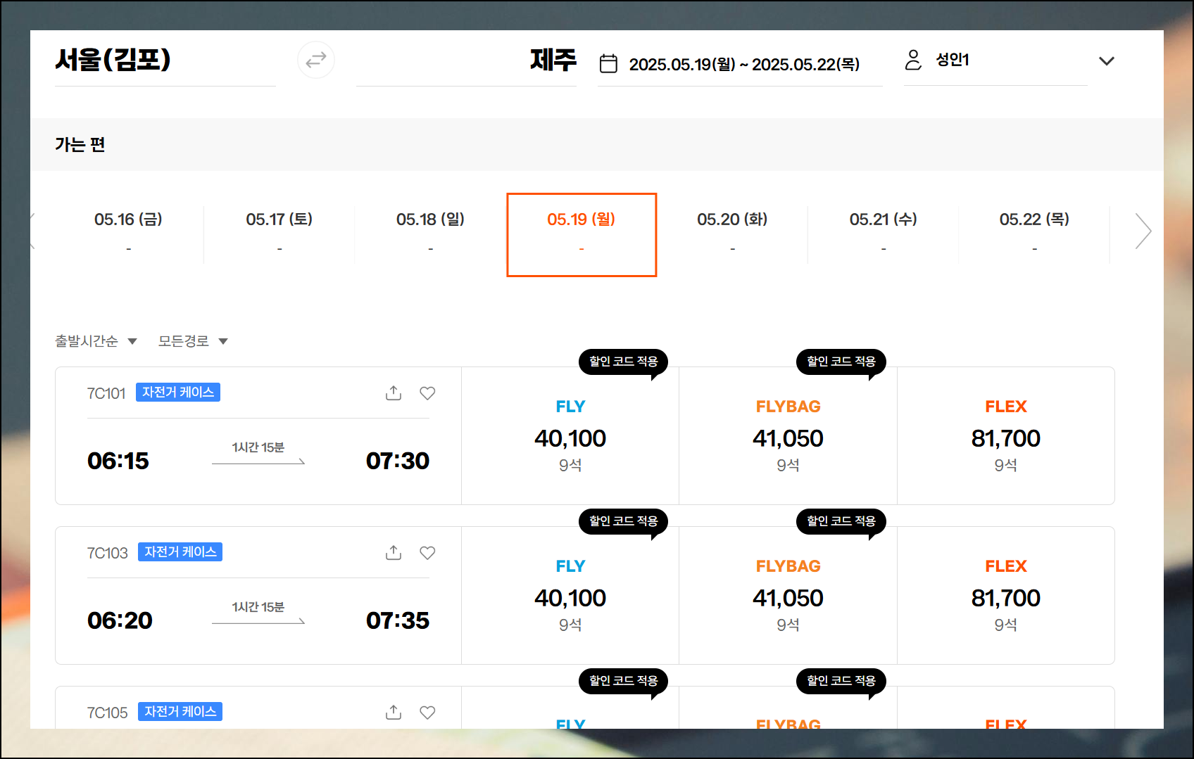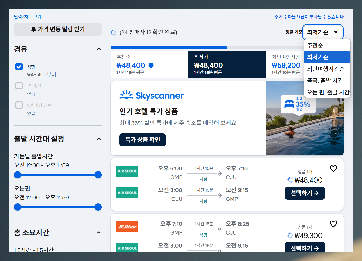 화면 좌측의 출발 시간대 필터를 조정하면 더욱 효과적으로 검색할 수 있어요. 이 기능을 활용하면 수많은 비행편 중에서 나에게 가장 적합한 제주도 왕복 노선을 쉽게 찾을 수 있습니다.