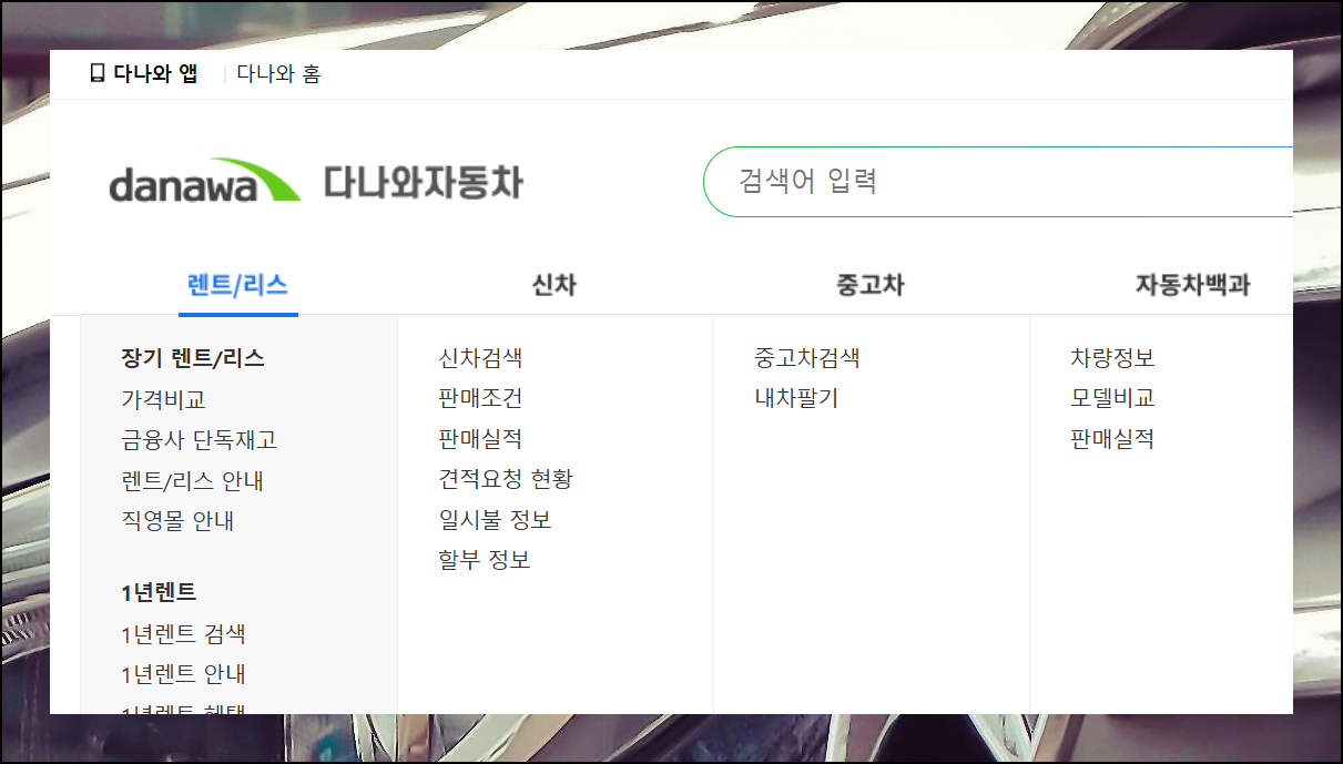 다나와 자동차 사이트에 들어가서 [리스]와 [가격비교] 메뉴를 선택하면 됩니다. 이곳에서는 리스 서비스뿐만 아니라 신차, 중고차, 렌트 가격표까지 한 곳에서 모두 확인할 수 있어요.