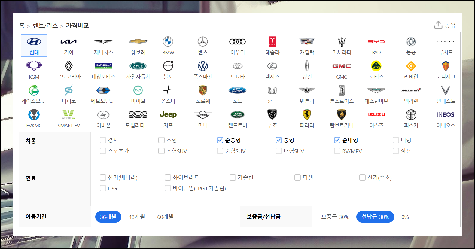 이제 월별 비용을 알아보고 싶은 자동차를 선택할 차례예요. 브랜드, 차종, 연료 유형부터 이용기간, 보증금, 선납금까지 내가 원하는 모든 조건을 설정할 수 있습니다. 예를 들어 현대차의 준중형, 중형, 준대형 모델을 36개월 이용 조건으로 검색하면 나에게 꼭 맞는 옵션들이 나타나요.