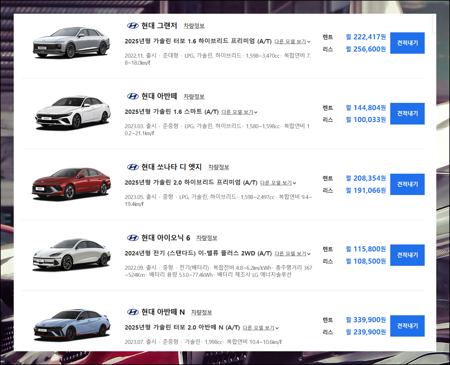 검색 결과로 나타난 5개 차량 모델의 월별 렌트와 리스 가격표를 확인해보세요. 처음 보이는 금액은 기본값이므로, 더 정확한 정보를 원한다면 [견적내기] 버튼을 눌러보세요. 이를 통해 자신의 상황과 선호도에 맞는 맞춤형 견적을 받아볼 수 있답니다.