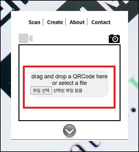 QR Code scanner 사이트에서 카메라 아이콘을 클릭하면 "drag and drop a QRCode here or select a file" 메시지가 표시됩니다.