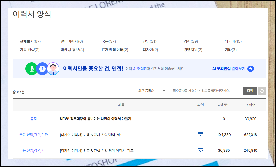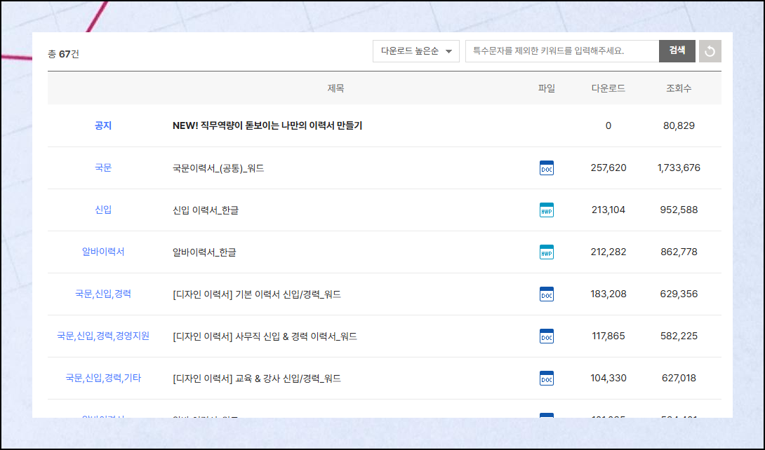 수많은 템플릿 중 어떤 것을 고를지 망설여진다면 다운로드 높은 순으로 정렬해보세요. 많은 구직자들이 선택한 인기 양식을 먼저 확인할 수 있어요.