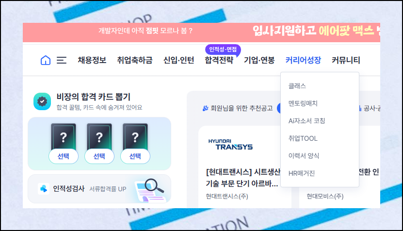 사람인 메인 페이지의 커리어성장과 이력서 양식 메뉴를 통해 다양한 서식에 접근할 수 있어요. 최근에는 AI 자기소개서 코칭 기능도 함께 이용 가능합니다.