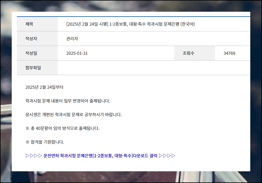 | 운전면허 필기시험 문제집 무료 얻기 (1) | 2025.06.05 |
