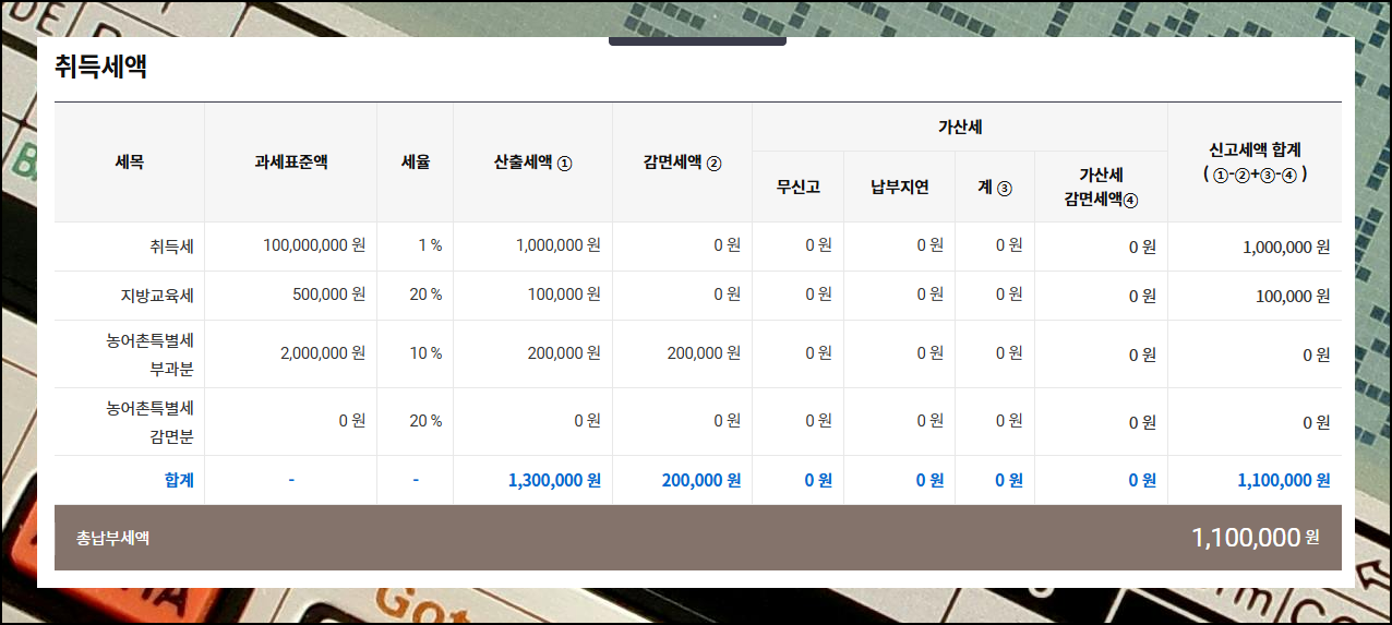 산정 결과 약 110만 원(1% 정도)이 나왔습니다. 가산세 구분이나 취득세 감면여부 등 추가 설정을 조절하면 더 정확한 결과를 얻을 수 있어요. 부동산 유형에 따라 금액이 달라질 수 있으니 참고하세요.