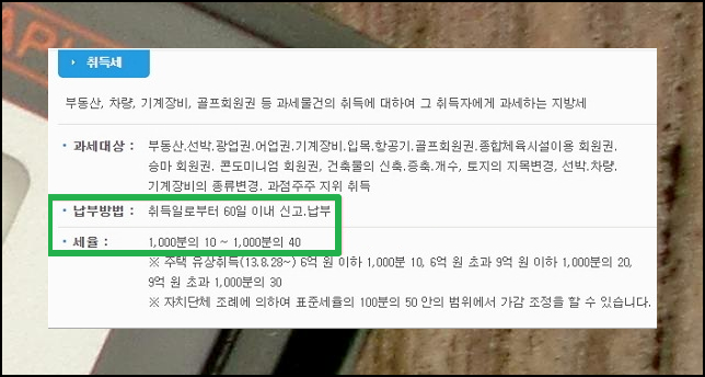 취득세에 관한 자세한 설명이 표시됩니다. 과세대상, 납부방법, 세율에 대한 내용을 꼼꼼히 살펴보세요. 계산기 사용 전에 필수적으로 알아야 하는 내용입니다.