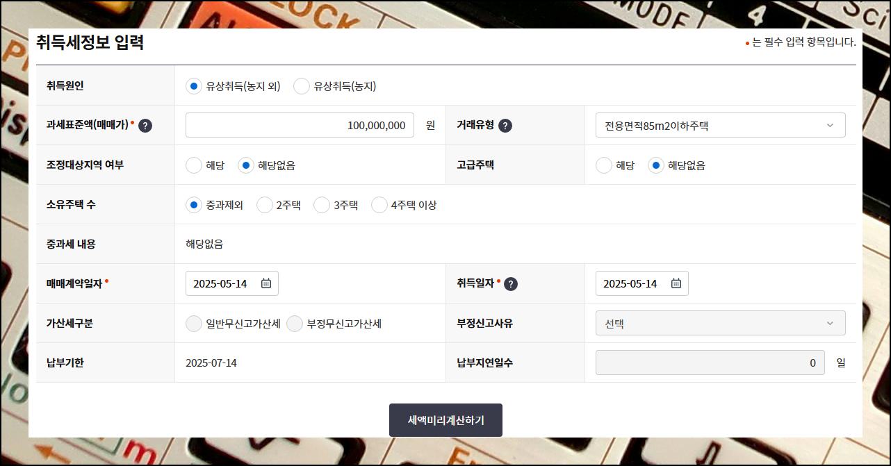 자동 계산기 입력창에 데이터를 넣어주세요. 예시로 1억 원짜리 주택을 유상 취득했다고 가정하고, 취등록세를 산출해볼게요.