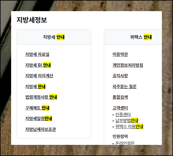 위텍스 사이트는 다양한 기능이 있어 '취등록세 자동 계산' 항목이 바로 보이지 않습니다. 일단은 지방세 정보 카테고리에 있는 [지방세안내] 메뉴를 선택해주세요.