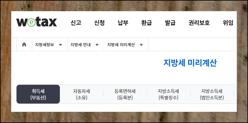 지방세 계산 페이지에 들어오셨네요. '취득세(부동산)'를 선택해주세요. 이 화면에서 자동차세, 등록면허세, 지방소득세 등 다른 세금도 여기서 이용할 수 있는 자동 계산기를 통해 쉽게 계산이 가능합니다.