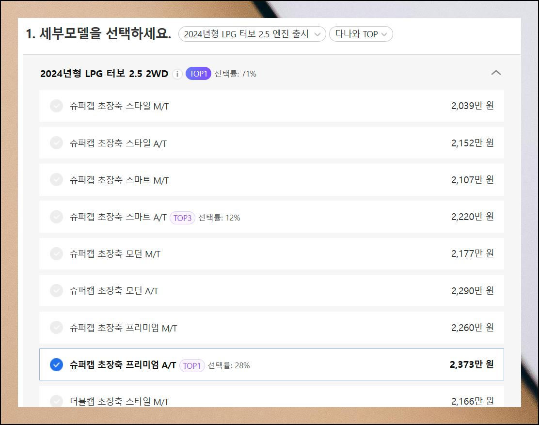 맞춤형 가격표 확인을 위한 첫 단계는 세부 모델 선택입니다. 표시된 선택률을 보면 어떤 1톤 차량이 인기 있는지 알 수 있어요.