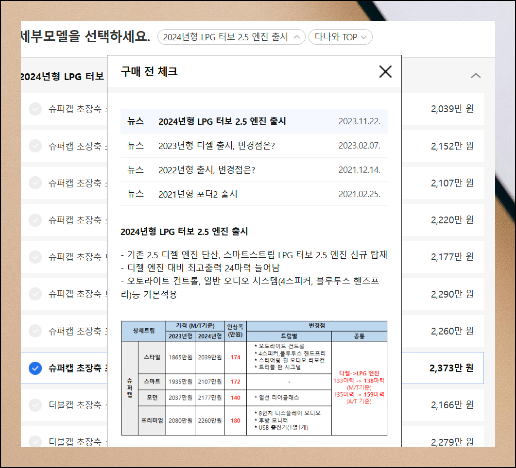 구매 전 체크사항에서 2024년형 현대 1톤 화물차의 출시 정보와 변경점을 확인할 수 있어요. 일부 모델의 가격이 소폭 올랐지만, 그에 따라 새로운 옵션들이 추가되었습니다.