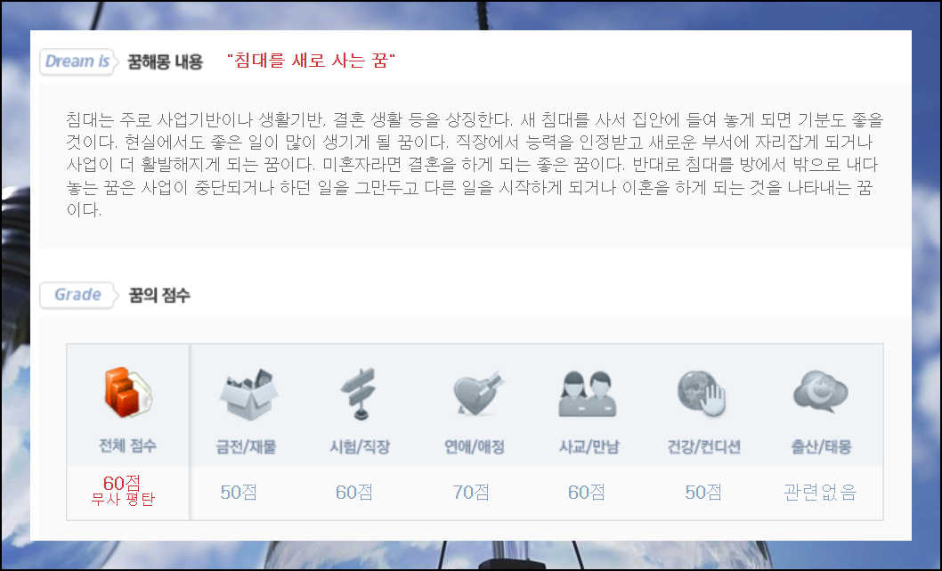 풀이의 내용이 애매해서 이해하기 힘들다면 꿈의 점수를 확인해보세요. 명확하게 좋고, 나쁨을 알 수 있습니다. 추가로 금전, 시험, 연애, 대인관계, 건강 등 여러 영역에서 이 꿈이 얼마나 긍정적인 영향을 미치는지 수치로 쉽게 확인할 수 있어요.