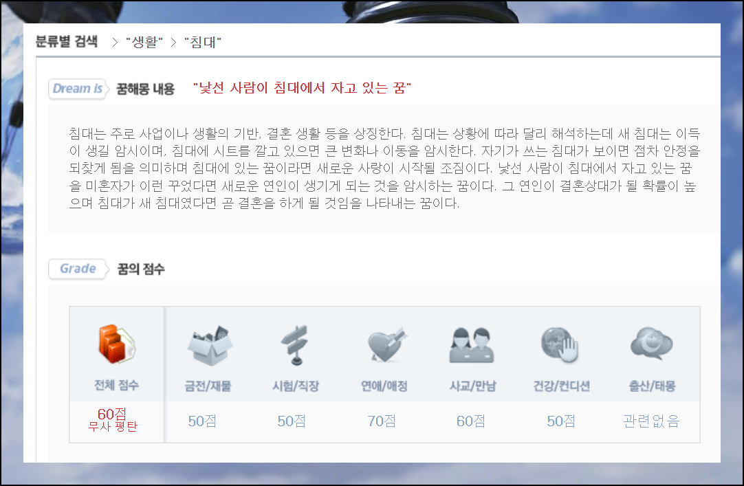 풀이의 내용이 애매해서 이해하기 힘들다면 꿈의 점수를 확인해보세요. 명확하게 좋고, 나쁨을 알 수 있습니다. 추가로 금전, 시험, 연애, 대인관계, 건강 등 여러 영역에서 이 꿈이 얼마나 긍정적인 영향을 미치는지 수치로 쉽게 확인할 수 있어요.