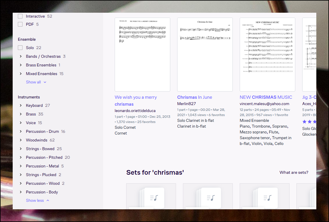 크리스마스 관련 곡을 예로 들어보죠. 검색 결과가 너무 많아도 악기 필터를 사용하면 내가 연주할 수 있는 것만 쏙쏙 골라낼 수 있습니다. 마음에 드는 곡을 발견했다면 클릭해서 자세한 내용을 확인해보세요.
