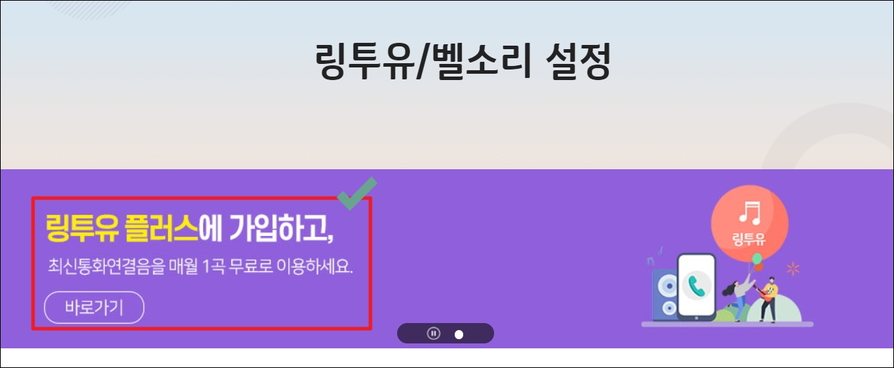 ▼사이트의 벨소리와 컬러링 설정을 할 수 있는 페이지가 열렸습니다. 안내 문구에 있는 링투유 플러스에 가입하게 되면 최신통화연결음으로 매월 1곡씩 무료로 이용이 가능하다고 합니다. 자주 컬러링 음원을 바꾸는 분들에게 좋은 서비스로 보입니다.