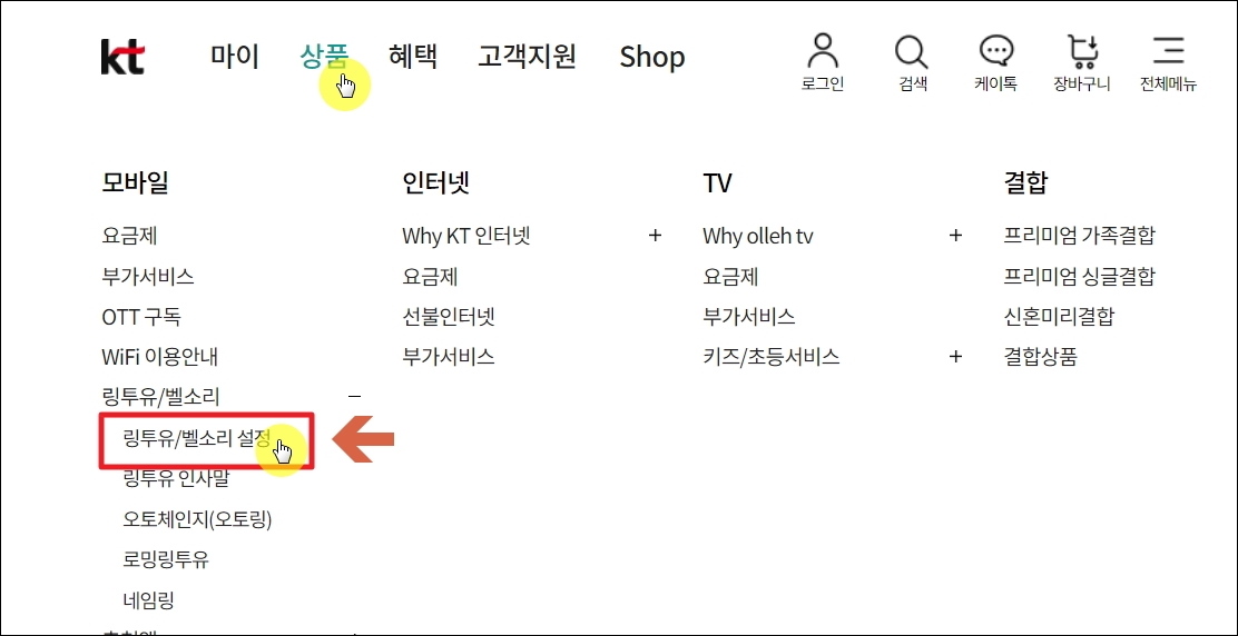 ▼KT 공식 홈페이지에 접속했습니다. 이곳에서는 인터넷, TV, 모바일 상품에 관련된 다양한 서비스를 제공하고 있습니다. KT의 경우에는 컬러링을 "링투유"라고 불립니다. 전체 메뉴에서 모바일 카테고리에 있는 "링투유/벨소리 설정"을 클릭합니다.