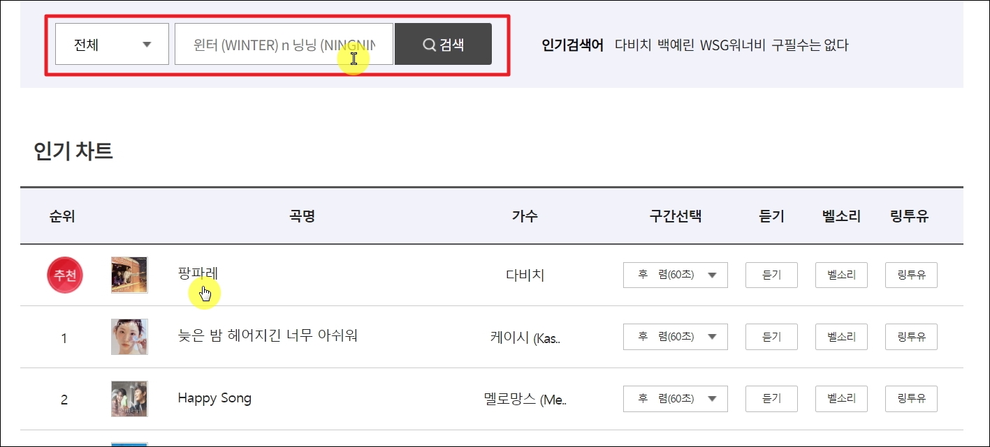 ▼평소 좋아하는 노래로 KT 컬러링 바꾸는법을 알려드리겠습니다. 새롭게 열린 페이지에서 가수나 노래 이름을 검색하면 됩니다. 그럼 다음과 같이 음원 리스트가 나타납니다. 여기에서 찾던 곡에 대해 [듣기] 버튼을 눌러봅니다.