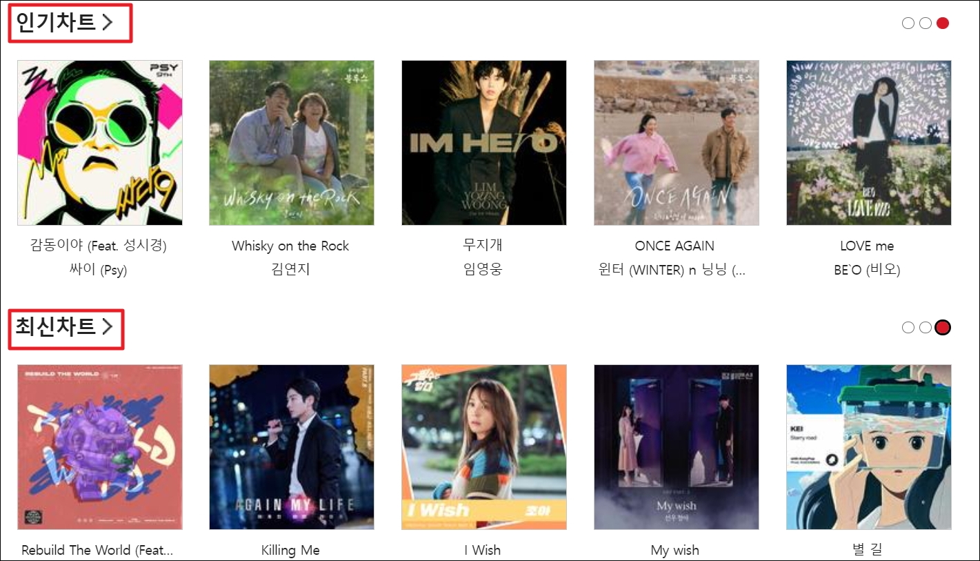 ▼화면을 아내로 내려보면 최신 인기차트를 만나볼 수 있습니다. 요즘에는 My dream, 늦은 밤 헤어지긴 너무, Happy Song, Ever Second가 순위권에 있네요. 여기에서 [인기차트]를 클릭해 보겠습니다.