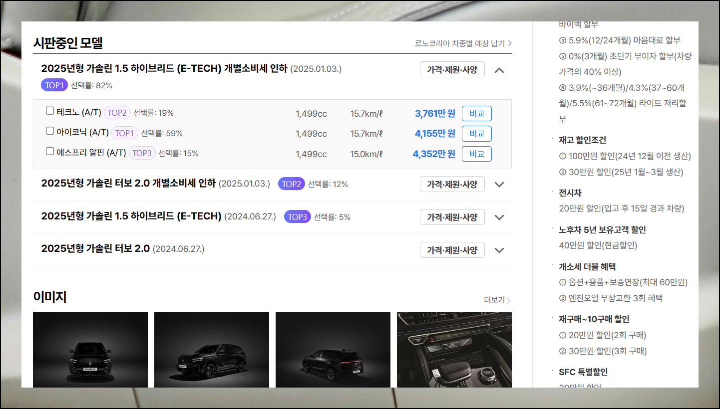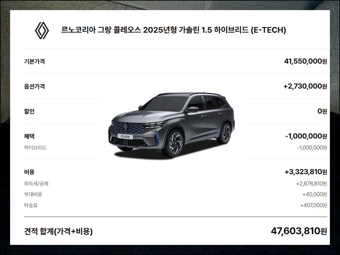 방금 직접 확인해본 결과를 보여드릴게요. 2025년형 르노삼성 그랑 콜레오스 가솔린 1.5 하이브리드 자동차 모델을 예시로 들면, 웹사이트에서 바로 정확한 최종 금액을 파악할 수 있어요.