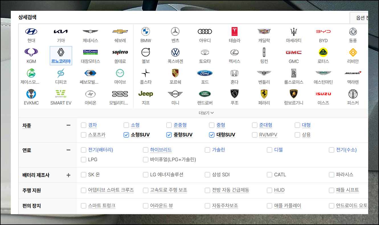 브랜드 선택 후 나오는 화면에서는 상세검색 기능을 꼭 활용해보세요. 관심 있는 차량 모델의 구체적인 조건을 미리 설정해두는 것이 효율적이에요. 아무 조건 없이 검색하면 르노삼성 전 모델이 다 나와서 원하는 정보를 찾기 힘들거든요.