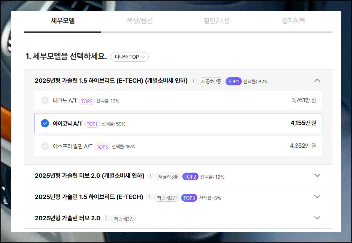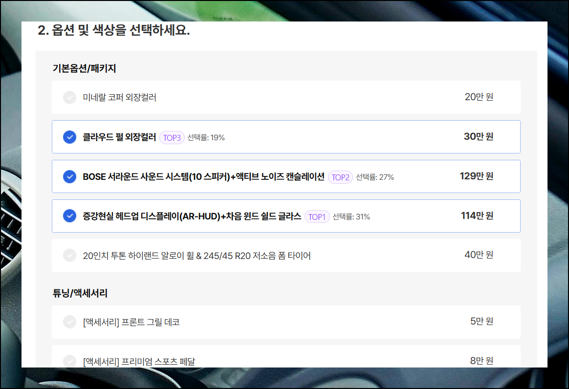 세부 모델이 정해졌다면 다음은 옵션 선택 단계예요. 신차 구매를 미리 계획해보신 분이라면 원하는 옵션들을 체크해주시면 됩니다.