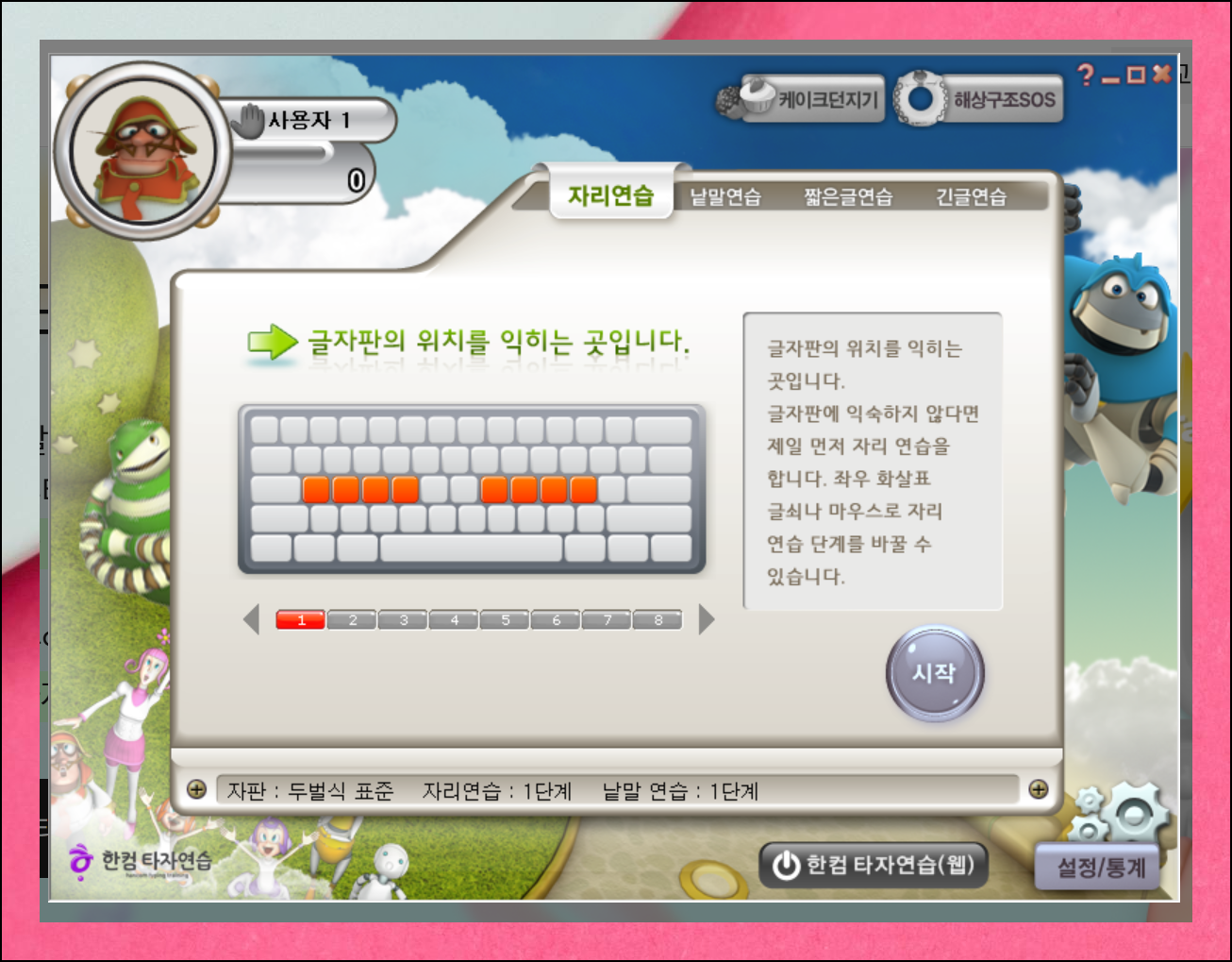 특히 여러 사람이 공유하는 컴퓨터라면 각자 개별 계정을 만드는 것을 추천해요. 프로그램이 정상적으로 실행되면 제일 먼저 도전해야 할 단계는 자리 익히기 과정입니다. 키보드의 각 버튼 위치를 익히는 단계에요.