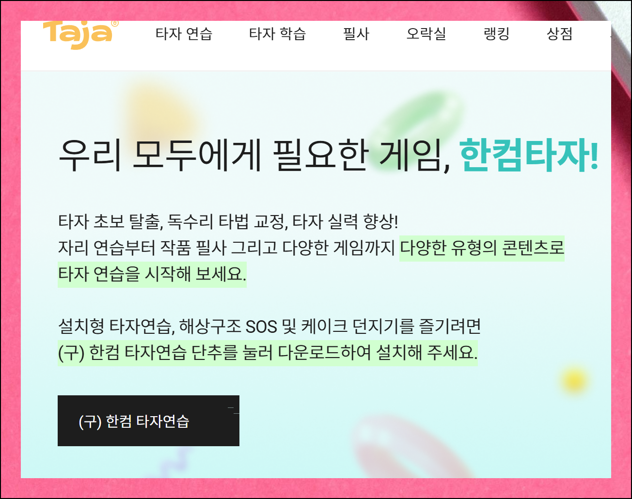 한국에서 가장 많이 쓰이는 문서 작성 프로그램 중 하나가 바로 아래아 한글 워드프로세서예요. 이 프로그램을 만든 회사에서 한글타자연습을 제대로 할 수 있도록 돕는 프로그램을 무료로 배포하고 있습니다.