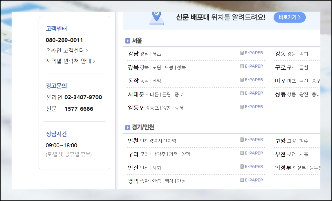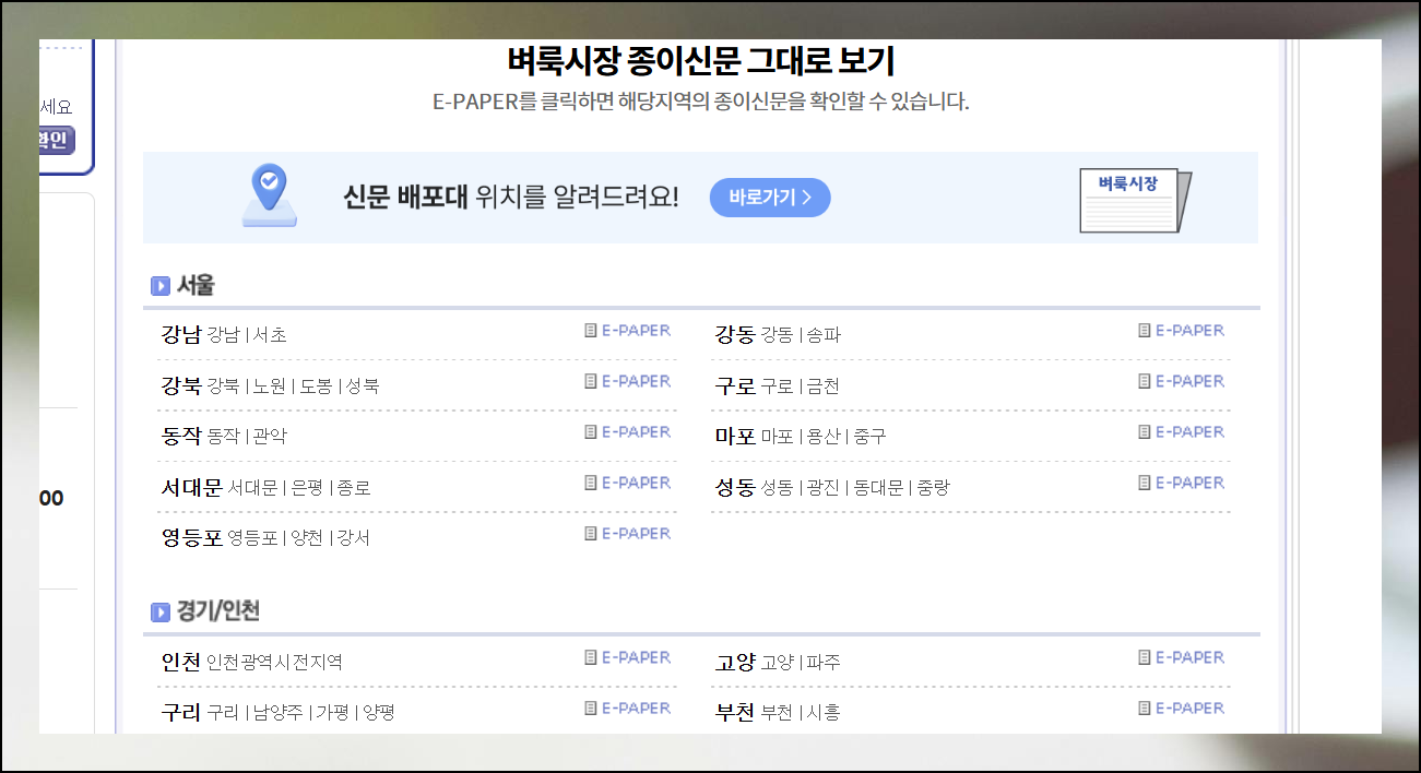 이번에는 익숙한 종이신문 형태로 채용 정보를 확인하는 방법을 안내해드릴게요. 만약 구인 광고를 게재하려면 화면 좌측에 위치한 [종이 신문 그대로 보기] 메뉴를 클릭하면 돼요. 해당 서비스는 지역별로 체계적으로 분류되어 있어요. 근무를 희망하는 지역을 먼저 선택해주시면 해당 지역 구인구직 데이터만 집중적으로 볼 수 있습니다.