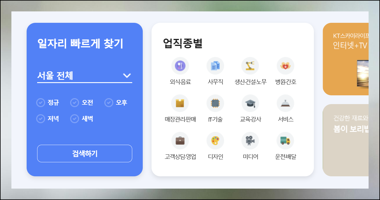 20대와 30대 젊은 구직자들에게는 웹페이지 형태가 훨씬 효율적일 거예요. 키워드 검색 한 번으로 원하는 일자리 정보를 즉시 찾아낼 수 있거든요. 전국 주요 도시 정보가 모두 들어있어요. 서울과 경기도는 물론이고 인천, 광주, 대구, 대전 지역까지 포괄적으로 다루고 있습니다. 직종도 정말 다양해요. 음식점 요리사부터 홀서빙, 공장 생산직, 각종 기술직, 매장 관리직, 간병이나 의료 관련 업무까지 거의 모든 분야를 망라하고 있어요.
