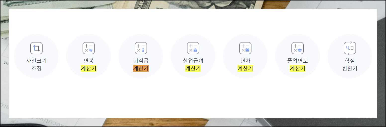 사람인 웹사이트를 예로 들어보겠습니다. 실업급여 산정 계산기는 물론이고, 연차 일수, 졸업연도 확인, 퇴직금 산출, 연봉 환산까지 다양한 계산기 프로그램을 이용할 수 있도록 되어 있습니다. 스크롤을 내려 페이지 맨 하단을 살펴보세요. 손쉽게 "실업급여 계산기"를 쉽게 찾을 수 있어요.