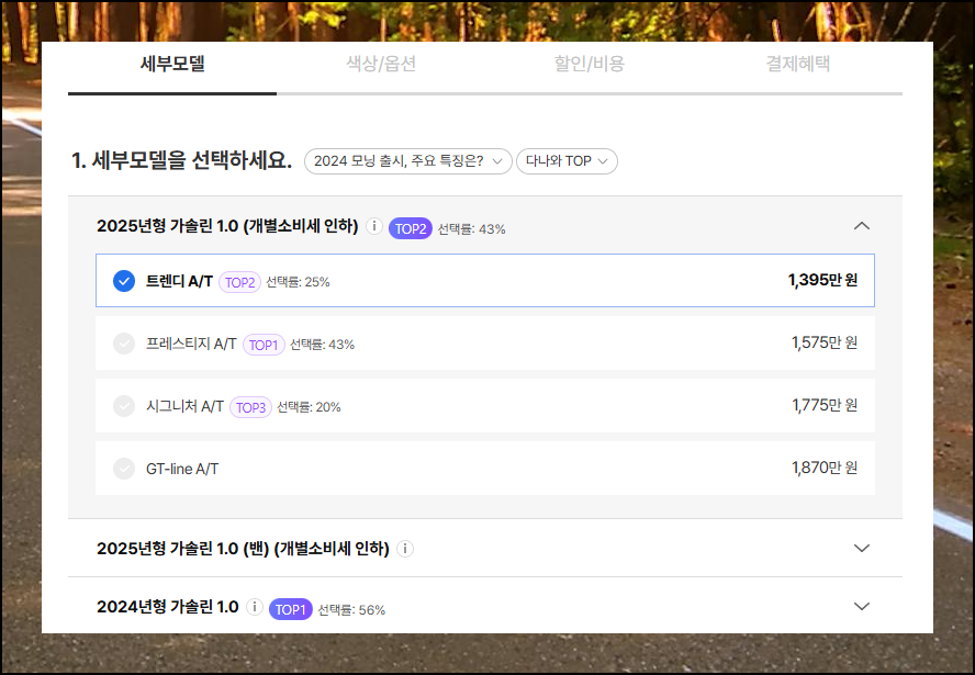 새로운 페이지가 열리면 마음에 드는 세부 모델을 선택하고, 원하는 옵션들을 체크할 수 있어요. 앞서 확인했던 판매조건 중에서 본인에게 적용 가능한 할인 혜택을 선택하고, 각종 부대비용과 관련된 항목들도 꼼꼼히 살펴보세요. 이 모든 선택 과정을 마치면 정확한 최종 가격표를 확인할 수 있어요.