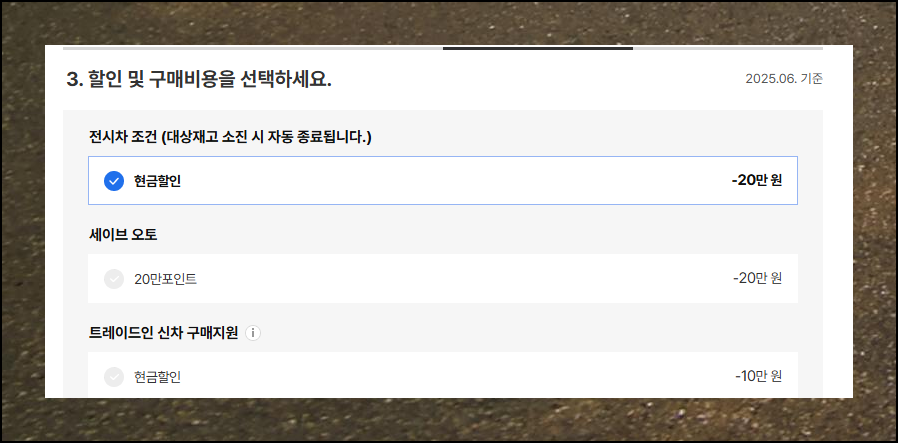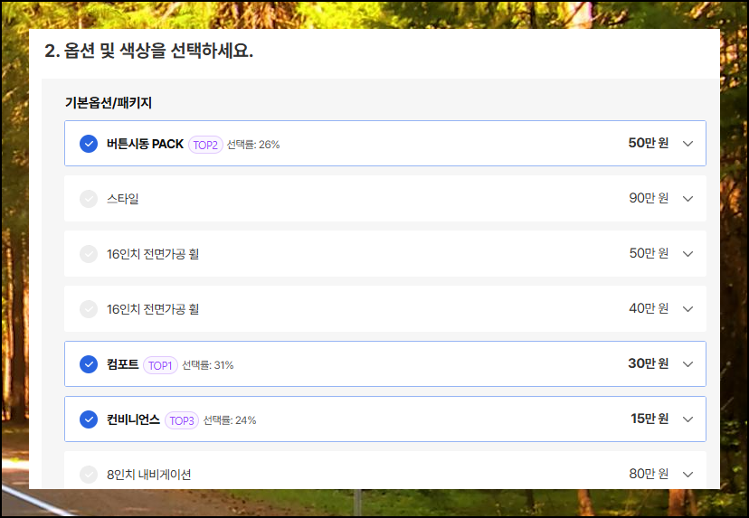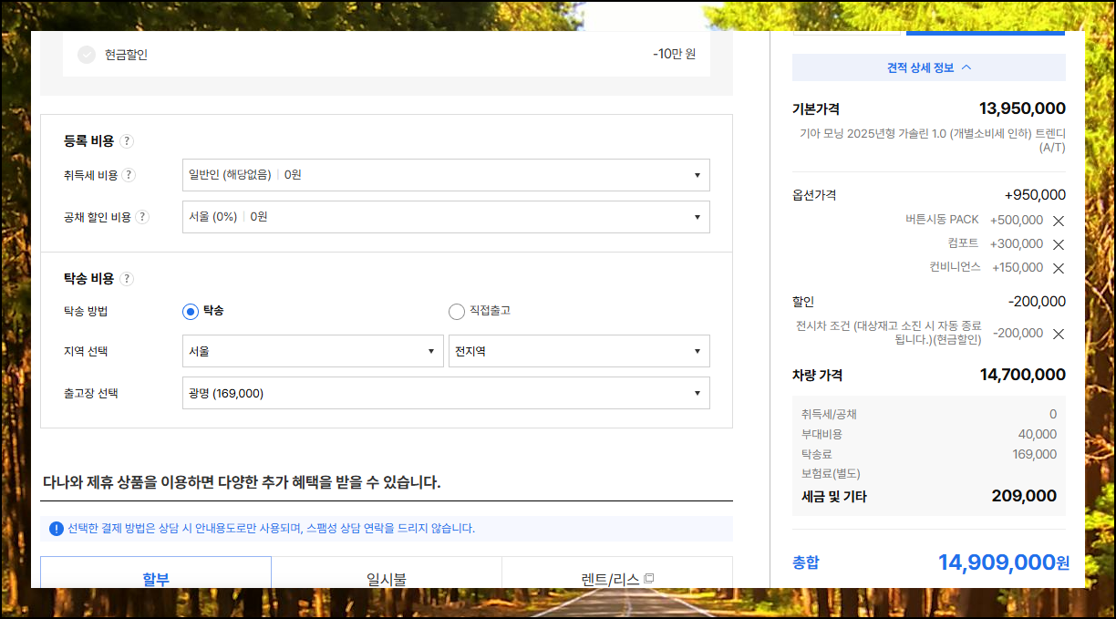새로운 페이지가 열리면 마음에 드는 세부 모델을 선택하고, 원하는 옵션들을 체크할 수 있어요. 앞서 확인했던 판매조건 중에서 본인에게 적용 가능한 할인 혜택을 선택하고, 각종 부대비용과 관련된 항목들도 꼼꼼히 살펴보세요. 이 모든 선택 과정을 마치면 정확한 최종 가격표를 확인할 수 있어요.