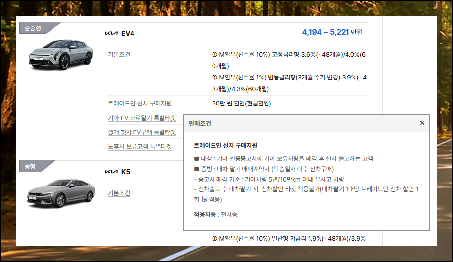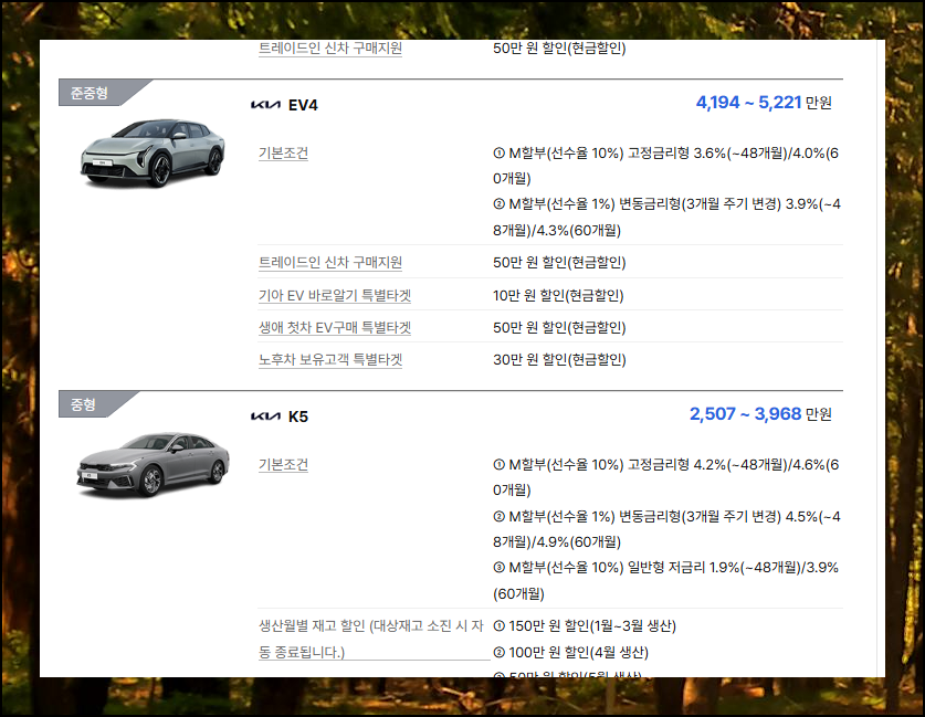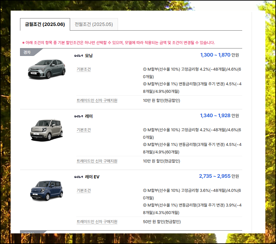 각각의 판매조건은 모든 차량에 동일하게 적용되는 것이 아니라 특정 모델에만 해당될 수 있어요. 생산월별 재고할인을 예로 들면, 기아차 브랜드의 라인업 중에서도 모닝, 레이, K3, K5만 적용된다고 명시되어 있어요.