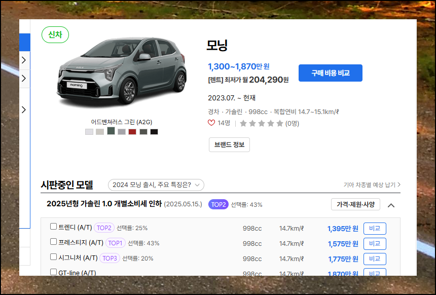 경차 카테고리를 선택하면 가장 먼저 모닝이 화면에 나타나요. 기아차의 모닝 출고가는 1,300만원부터 1,870만원까지 다양한 가격대를 형성하고 있어요. 여기서 주목할 점은 추가 혜택들인데요.