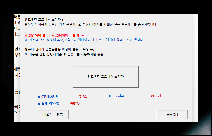 윈도우즈 프로세스 정리 기능이 활성화되면서 본격적인 최적화가 시작됩니다. 이 도구는 인터넷 응답 속도가 저하되거나 온라인 게임 중 끊김 현상이 발생할 때 특히 유용해요. 시스템 운영에 필수적인 핵심 프로세스들만 남겨두고 나머지는 모두 종료 시켜 리소스를 확보합니다. 메인 화면 중앙의 "윈도우즈 프로세스 초기화" 버튼 하나만 누르면 모든 과정이 자동으로 진행됩니다.