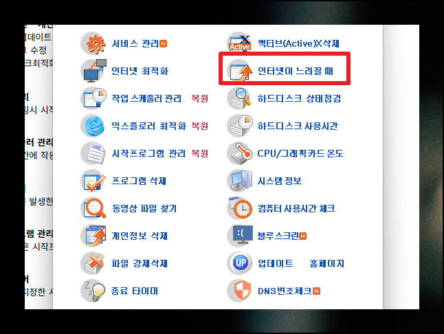 고클린을 실행하면 생각보다 풍부한 기능 메뉴가 준비되어 있음을 확인할 수 있어요. 각종 최적화 도구들이 카테고리별로 잘 정리되어 있습니다. 인터넷이 느려요 하는 상황에서는 "인터넷이 느려질 때" 전용 메뉴를 찾아 클릭하면 됩니다.
